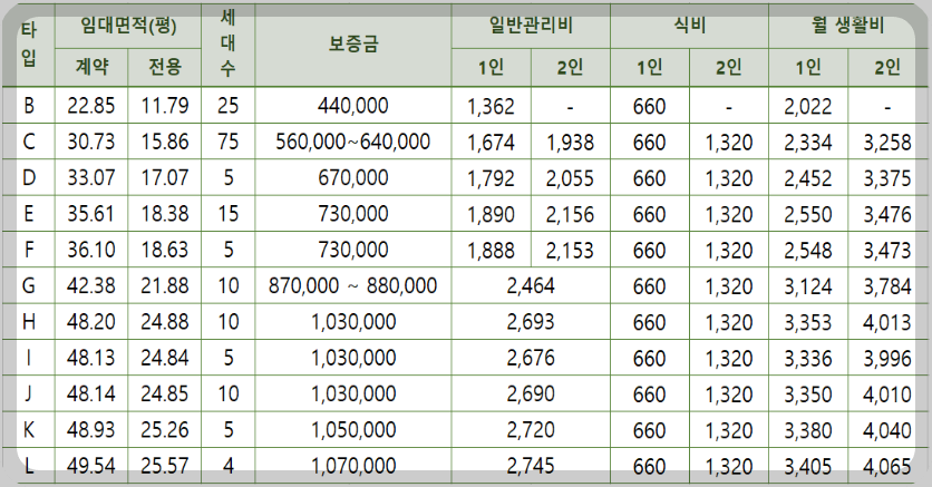 - 일반관리비: 직원 인건비, 공용시설 유지비, 소모품비, 화재보험료, 세대청소비 포함