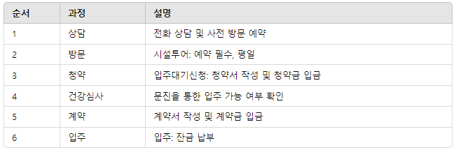 상담 → 방문 및 시설투어 → 청약 및 청약금 입금 → 건강심사 → 계약 및 계약금 입금 → 입주