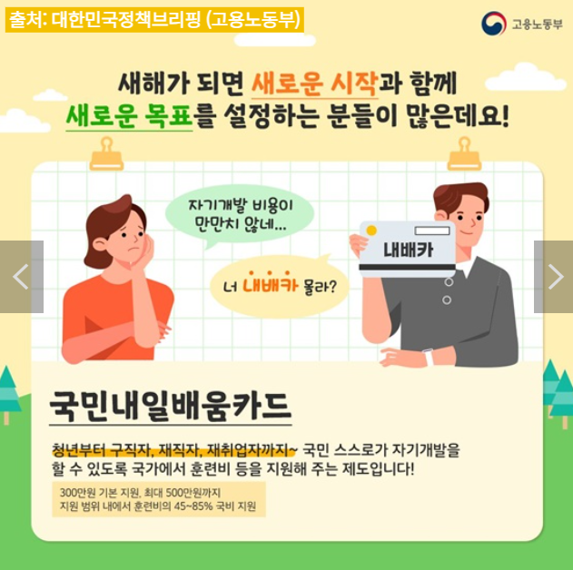 - 내일배움카드는 취업, 이직, 역량 개발에 필요한 훈련을 카드 한장으로 할 수 있는 국가 일자일 지원 제도입니다.