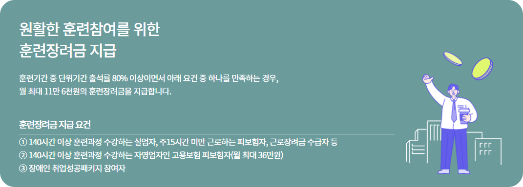 - 단, 내일배움카드 교육의 출석률이 80% 미만이거나 실업급여를 받고 있다면 지급되지 않습니다.