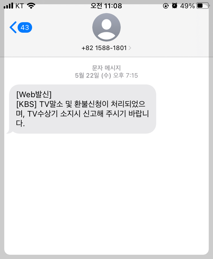 유선상 환불 접수 후 정상적으로 환불이 진행되었는지 문자 및 입금계좌를 통해 확인해 주세요. 저는 유선상 문의한 결과, 상담원께서 신속히 접수해 주셔서 납부한 수신료를 잘 환불받았습니다. 저의 경우, 입주 이후 계속해서 TV가 없었습니다.