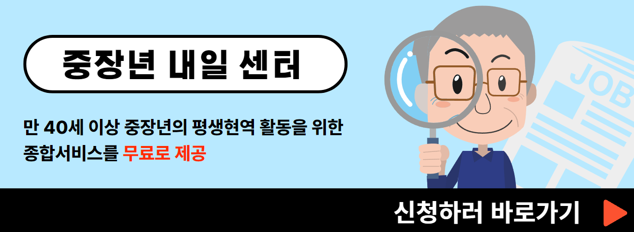 중장년 내일센터는 만 40세 이상 중장년의 일자리를 지원하는 기관으로, 다양한 취업 지원 서비스를 무료로 지원하며 중장년의 일자리 연계를 돕습니다. 40세 이상의 대상자시라면 취업지원서비스를 무료로 받아보세요.